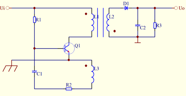 單端自激式開關電源,畫出溝通通路可以發現變壓器的初級兩個線圈別離接三極管的三個電極,所以又稱電感三點式。三極管既做開關元件又做振動元件,好處是不需要外加控制信號,缺陷是不穩定,功率低下。常用于小功率開關電源,比如一些手機的充電器便是采用這種方式。電路的頻率取決于C1和R2的參數,兩者的阻抗和為R2一1/joC