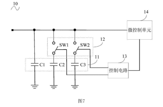2.如以上的啟動電路,其特征在于,啟動電路包括與開關器件連接的控制電路和與控制電路連接的微控制單元,微控制單元連接電容電路并用于在開關電源上電過程中控制控制電路按照設定時序驅動開關件的通斷狀態調節電容電路的電容值。電路包括第一電阻、第三極管和第一二極管,第一三極管的基極連接第一電阻的一端,第一三極管的集電極連接第一二極管的正極和開關件,第--三極管的發射極接地,第一電阻的另一端連接微控制單元,第一二極管的負極連接預定供電電壓和開關件。