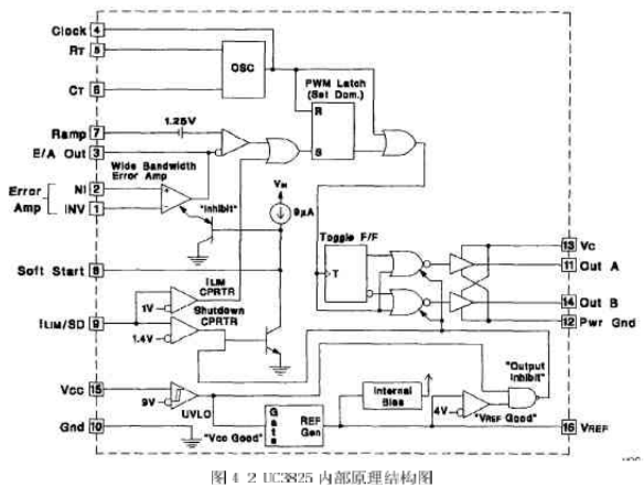 上升沿封鎖工作波形如圖4-4所示,UC3823A、B和UC3825A、B采用固定頻率脈寬調制。UC3823A、B的兩個輸出端可同時輸出脈沖,輸出脈沖的頻率與振蕩器頻率相等,脈沖占空比可在0%~100%內調整。UC3825A、B的兩個輸出端交替輸出脈沖,因此,每個輸出端輸出脈沖的頻率是振蕩器頻率的1/2,振蕩器的頻率為200KHZ,所以輸出PWM-脈沖的頻率為100KHz,輸出脈沖占空比在0%~一50%以內調整,實際橋式變換器的應用中一般達不到50%,因為橋式變換器在PWM脈沖的占空比為50%時,由于功率管截止時間的問題,使得橋臂容易短路,這在以后的部分將詳細介紹。