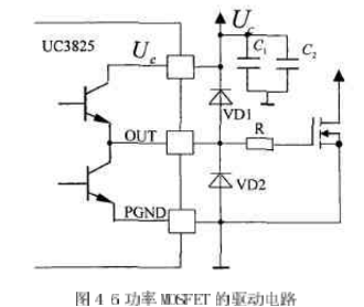 功率MOSFET 驅動電路如圖4-6所示。UC3825推拉式輸出電路的每個輸出端都可輸出峰值為2A的電流。該輸出電流在20ns內可使1000pF電容兩端的電壓上升15V。采用獨立的集電極電源Uc和功率地線PGND 腳,能夠減小大功率門極驅動噪聲對集成電路內模擬電路的干擾。每個輸出端(OUT)到Uc和 PGND之間,都應加入一只3A的肖特基二極管(IN5120,USID245或相同性能的器件),如圖4-6所示。該二極管可將輸出電壓的幅值鉗位在電源電壓,這對任何電感性和電容性負載都是必要的。