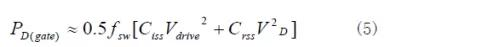 功率MOSFET驅動效率比雙極型功率晶體管高。MOSFET柵極有兩個與漏源極相連的等效電容,即柵源電容Ciss和漏源電容Crss。MOSFET柵極驅動的損耗來自于開通MOSFET時輔助電壓對柵極電容的充電,關斷MOSFET時又對地放電。柵極驅動損耗計算由式(5)給出。
