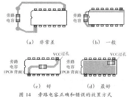 旁路電容(Decouple)的放置也要考慮到它的串聯電感值。旁路電容必須是低阻抗和低ESL乩的瓷片電容。但如果一個高品質瓷片電容在PCB上放置的方式不對,它的高頻濾波功能也就消失了。圖14顯示了旁路電容正確和錯誤的放置方式。