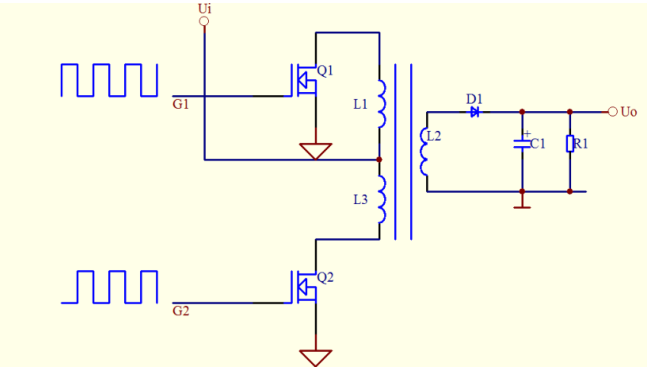 該種開關電源成本較低,可以輸出多組不同的電壓,電壓調整方便,因而使用非常廣泛。首要缺點是:紋波電壓較大(一個周期僅作業半個周期左右)。另一點便是,當Q截止時,Q1承受很大的反向電壓。U=2Ui,所以Q1挑選耐壓較大的。