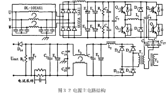 本電源采用ZVZCS-PWM拓撲,原邊加奔位二極管,三相溝通輸入整流后,加LC濾波,以提高輸入功率因數,主功率管選用IGBT,控制電路采用UC3875移相控制專川集成芯片,電流電壓雙閉環控制。具體設計主電路如圖3-2所示,包含三個部分:(1)輸入整流濾波電路;(2)單相逆變橋;(3)輸出整流濾波電路.