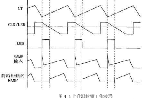 上升沿封鎖工作波形如圖4-4所示,UC3823A、B和UC3825A、B采用固定頻率脈寬調制。UC3823A、B的兩個輸出端可同時輸出脈沖,輸出脈沖的頻率與振蕩器頻率相等,脈沖占空比可在0%~100%內調整。UC3825A、B的兩個輸出端交替輸出脈沖,因此,每個輸出端輸出脈沖的頻率是振蕩器頻率的1/2,振蕩器的頻率為200KHZ,所以輸出PWM-脈沖的頻率為100KHz,輸出脈沖占空比在0%~一50%以內調整,實際橋式變換器的應用中一般達不到50%,因為橋式變換器在PWM脈沖的占空比為50%時,由于功率管截止時間的問題,使得橋臂容易短路,這在以后的部分將詳細介紹。