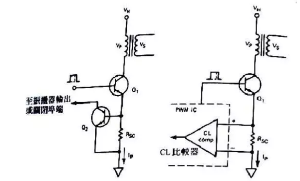 (a)圖:在輸出端有過載或短路情況發(fā)生時(shí),此時(shí)初級(jí)電流會(huì)很快的增加,Rsc上的就會(huì)產(chǎn)生電壓,此電壓超過B-E的導(dǎo)通電壓,那么Q2就會(huì)導(dǎo)通,就會(huì)把Q2集電極電位拉到地,如果接的是震蕩電路此時(shí)就會(huì)導(dǎo)至震蕩電路停止工作,從而達(dá)到保護(hù)的目的。