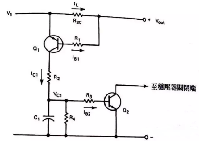 工作原理是:在正常的工作情況下,流入到Rsc上的Il不會(huì)產(chǎn)生很大的壓降,那么就不會(huì)使Q1導(dǎo)通,若負(fù)載電流足夠大就會(huì)在Rsc上產(chǎn)生電壓,使Q1導(dǎo)通。若Q1在OFF裝態(tài)時(shí),而且Ic1=0時(shí)C1會(huì)全部放電掉,因此Q2也會(huì)處于OFF狀態(tài),如果Il電流逐漸增加時(shí),則Il*Rsc=VbeQ1+Ib1R1,此時(shí)會(huì)集電極會(huì)有電流Ic1流過,并有下面的時(shí)間常數(shù)將C1充電T=R2*C1,那么C1上的電壓是:Vc1=Ib2R3+VbeQ2,為了使為了使電容器電壓的負(fù)載效應(yīng)減到最低值,我們可選用具有較高的HFE的達(dá)林凳管子來代替Q2,這樣可以把基極電流限制在微安培,我門在選擇電阻R4時(shí)要遠(yuǎn)遠(yuǎn)大于R3。這樣當(dāng)電流過載時(shí),C1電容會(huì)快速放電。