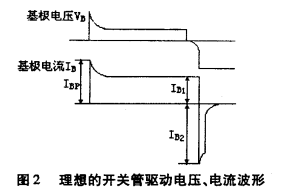 開關管的損耗與其基極的驅動電壓、電流的波形有直接的關系,理想的基極驅動波形如圖2所示。