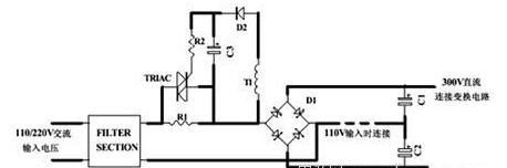 上圖所示為串聯電阻法沖擊電流控制電路(適用于橋式整流和倍壓電路,其沖擊電流相同),關于110V、220V雙電壓輸入電路,應該在R1和R2方位放兩個電阻,這樣在110V輸入銜接線銜接時和220V輸入銜接線斷開時的沖擊電流相同大。關于單輸入電壓電路,應該在R3方位放電阻。