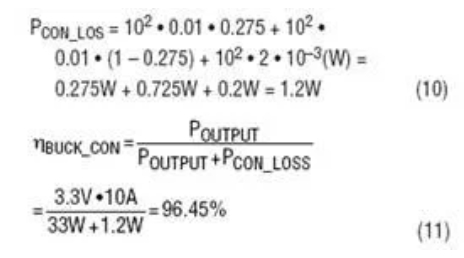 例如,12V輸入、3.3V/10AMAX輸出降壓電源可使用以下元件:MOSFETRDS(ON)=10mΩ,電感RDCR=2mΩ,二極管正向電壓VD=0.5V。因此,滿負(fù)載下的傳導(dǎo)損耗為: