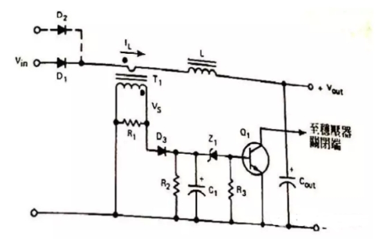 作業原理是:T1用來檢測負載電流IL,因此電阻R1會有成比例的電壓發生。D3為整流二極管,R3C1整流后的濾波電路,若電流過載發生時,電容器C1上的電壓會添加到穩壓二極管Z1的導通電壓,此刻三極管Q1會導通,因此Q1集電極上的信號可以封閉穩壓器的驅動信號。