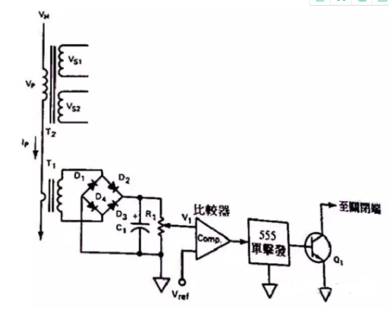 T1用來檢測T2的初級電流,T1后經二極管整流后電容濾波,可變電阻R1用來設定比較器輸入端的臨限電壓,在正長作業情況下,比較器的Vref參考輸入端電壓會高于電衛器R1上的電壓,此刻比較器的輸出會在高電平,此刻的555IC(單激多諧振蕩器)會有低電平的輸出,使Q1堅持在封閉情況。