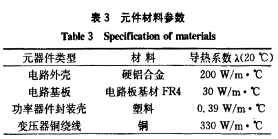 3)功耗參數:本例電源系統的主要發熱元件共有16個,電路中主要發熱器件各接觸面的損耗可由(4)式求得,其中變壓器的損耗可分別由文獻[3]中的銅損及鐵損的計算公式分別求得。本例中將計算得到的各個主要發熱元器件的功率損耗值,依照參數類型歸類整理,如表2所示。