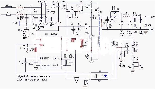 U1芯片和1、2腳外圍元件R7、C12,也是穩壓回路的一部分。實際上,TL1、U1組成了(相對于U1內部電壓誤差放大器)外部誤差放大器,將輸出24V的電壓變化反饋回U1的反饋電壓信號輸入端。