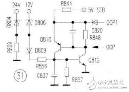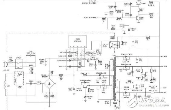 3、保護回路:U1芯片本身和3腳外圍電路構成過流保護回路;N1繞組上并聯的D1、R1、C9元件構成了開關管的反向電壓吸收保護電路,以提供Q1截止時的反向電流通路,保障Q1的工作安全;實質上穩壓回路的電壓反饋信號,也可看作是一路電壓保護信號——當反饋電壓幅度達一定值時,電路實施停振保護動作;24V的輸出端并聯有由R18、ZD2、單向晶閘管SCR組成的過壓保護電路,當穩壓電路失常,引起輸出電壓異常上升時,穩壓二極管ZD2的擊穿為SCR提供觸發電流,SCR的導通形成一個“短路電流”信號,強制U1內部保護電路產生過流保護動作,電路處于停振狀態。