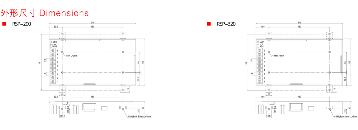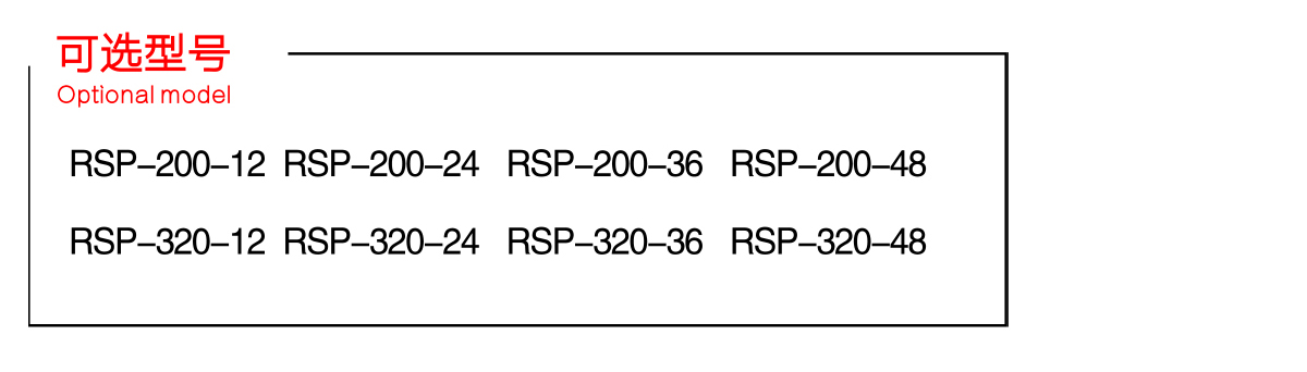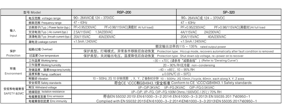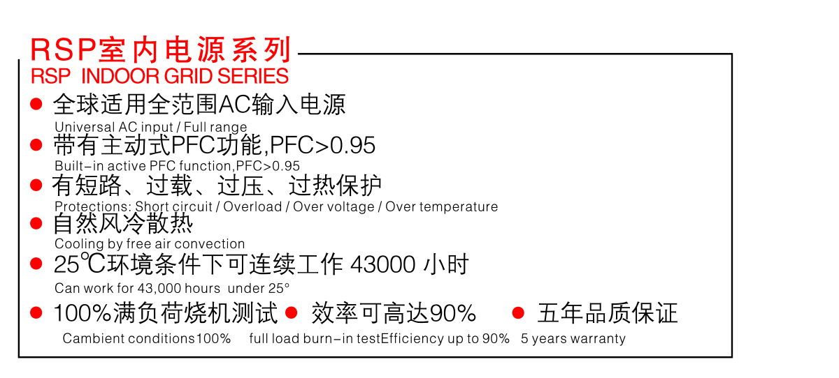 內建主動式功率因子矯正功能(active PFC) 1U 低高度設計—75W~320W: 30 mm, 500W: 40.5 mm 內建恒流限制線路 (RSP-75/100/150) 內建遙感功能(remote sense) (僅RSP-500)